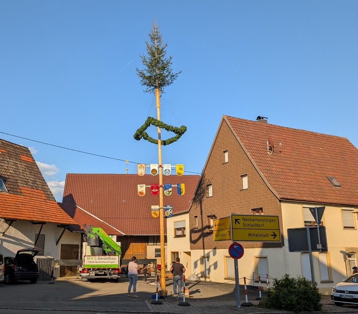 Die Eröffnung der Hockete fand um 18 Uhr mit dem Aufstellen des Maibaums statt. Unter den Blicken vieler Zuschauer wurde der Baum mit Unterstützung der MPG Gerüstbau (LKW-Kran), der Gemeinde, Markus Fritsch und René Heim vom Team Stückle an seinem Bestimmungsort im Hof der Familie Haug in die Höhe gezogen, aufgestellt und verankert.